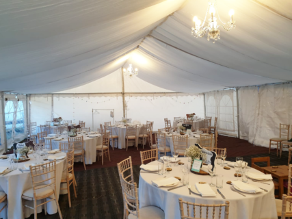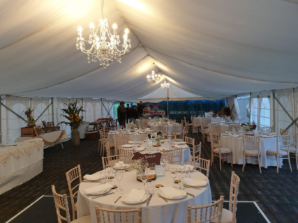We were delighted to supply and erect a 9m x 24m Fusion Modular Marquee, complete with linings, chandeliers, flooring and a dance floor for a wedding function at Lawn Farm in Whiston, Rotherham. Something of that size would be enough to cover up to 400 people, but as you can see from the images, that space was used to create an amazing, elegant function room with plenty of space for all. We used our network of partners to ensure that our client could also have their tables and chairs decorated in fitting with the occasion.